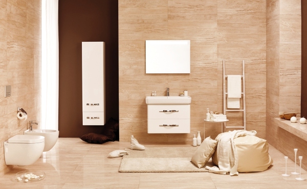 Zarówno ceramika, jak i systemy przechowywania utrzymane są w tonacji czystej bieli. Ta świadoma rezygnacja z przepychu i feerii barw daje przy urządzaniu łazienki możliwość sięgnięcia po bardziej wyrafinowane faktury płytek czy kolorowe akcenty dekoracyjne.